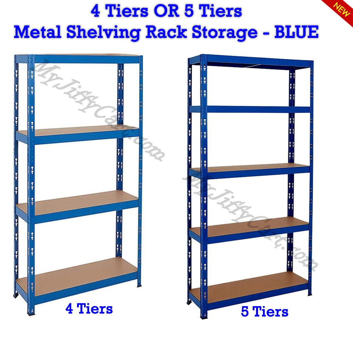 Shop Now4 Tiers or 5 Tiers, bolt-less screw-less BLUE steel metal shelving racking. Ideal storage solution for home, office, garage, conservatory, shed, stockroom or workshop, etc.