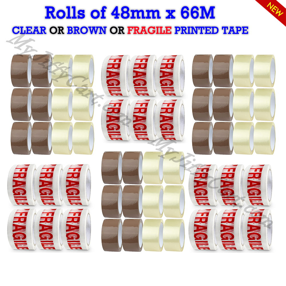 Shop NowRolls of 48mm x 66m carton sealing strong adhesive packing tapes. Available in CLEAR or BROWN or FRAGILE printed. Also Duct/Cloth tapes and Masking tapes.